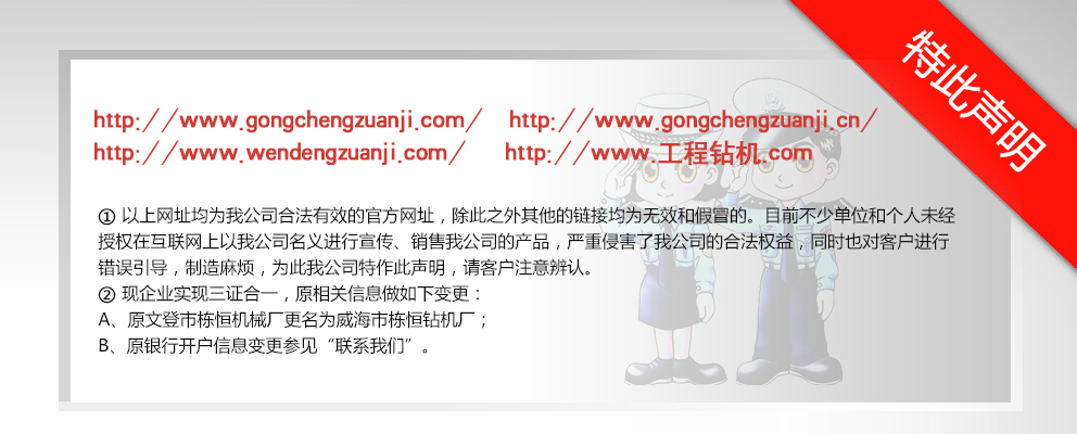 威海市棟恒鉆機廠隸屬于文登市工程鉆機廠,主要生產、銷售工程鉆機。它坐落于文登市西鋪頭工業園,這里科技發達,交通便利,制造業集中。 自1982年建廠以來,經過多年的優化改革和沉淀積累,擁有精密、大型加工設備近百臺的生產企業之一。現在研制成功的GJ-400、GJ-250S、GJ-250A、GJ-240S、GJ-240A、GJ-180S、GJ-180A型等鉆機。在其它產品上,企業建立了長期、中期、短期的發展規劃,一系列的高性能產品正在不斷推出中,企業應市場需求對系列產品進行了優化組合,開發了與之對應配套的三腿、四腿單天車輪、雙天車輪鉆塔;泥漿泵—BW-160Q、BW- 200Q型球形閥泥漿泵大大提高了泵的使用性能和機械效率